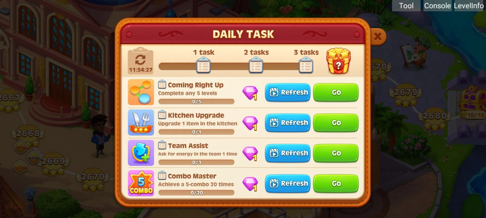 A: There will be several random tasks every day. Complete a task to earn 1 Diamond! Complete any three tasks to get a random bonus! Refresh a task by watching ads!